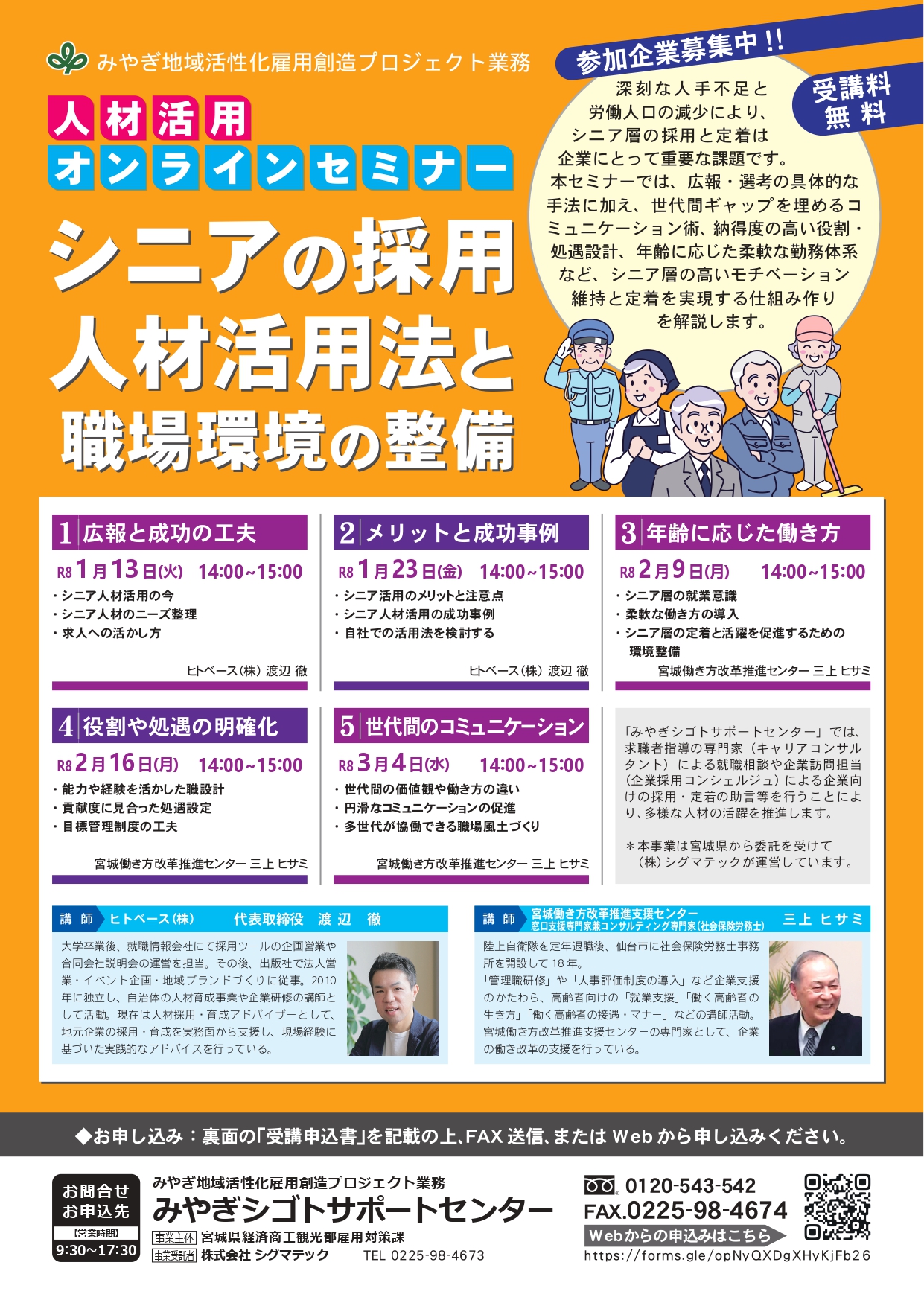 あわせて、社会保険労務士 三上ヒサミ氏による講義では、シニア層の就業意識や定着・活躍を促進するための職場環境整備についても取り上げます。